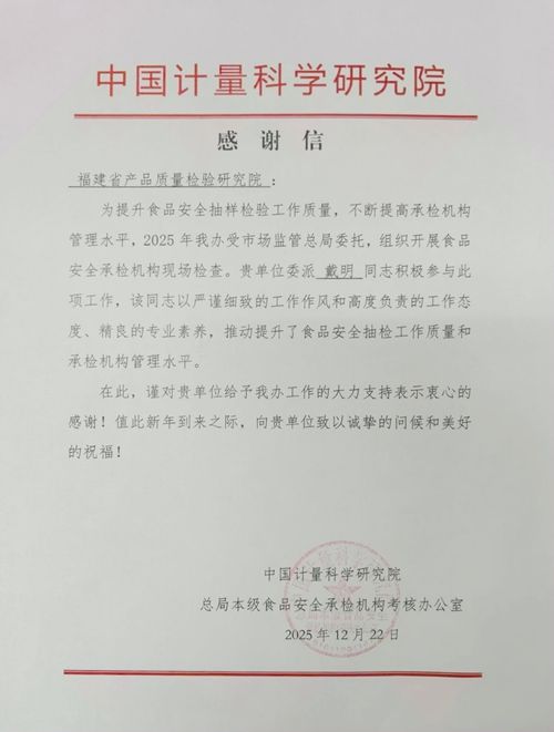 近日,福建质检院收到中国计量科学研究院、总局本级食品安全承检机构考核办公室感谢信,对福建质检院现代食品中心技术负责人戴明同志在2025年度食品安全承检机构现场检查工作中的突出表现给予高度肯定和诚挚感谢。