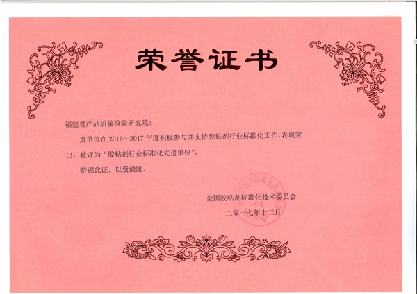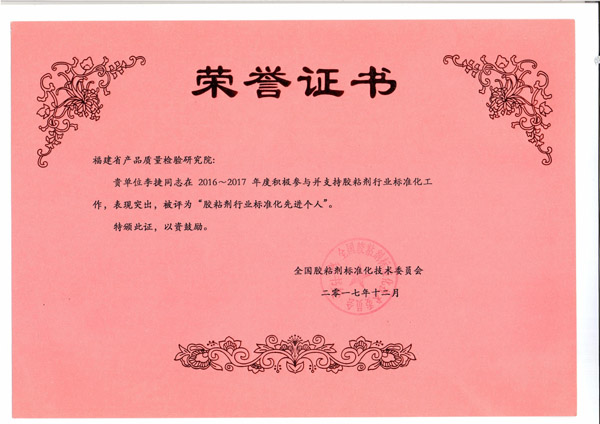 近日,我院收到全国胶粘剂标准化技术委员会颁发的胶粘剂行业标准化先进单位、先进个人证书,对我院在制订国家标准《装修防开裂用环氧树脂接缝胶》中的工作给予充分肯定。